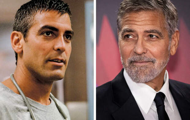 Слева кадр из сериала «Скорая помощь», в котором Клуни снимался с 1994 по 2000 год, справа — фото 2021 года.